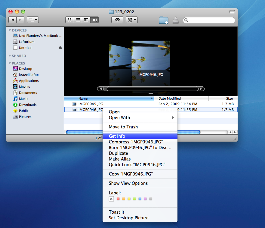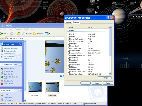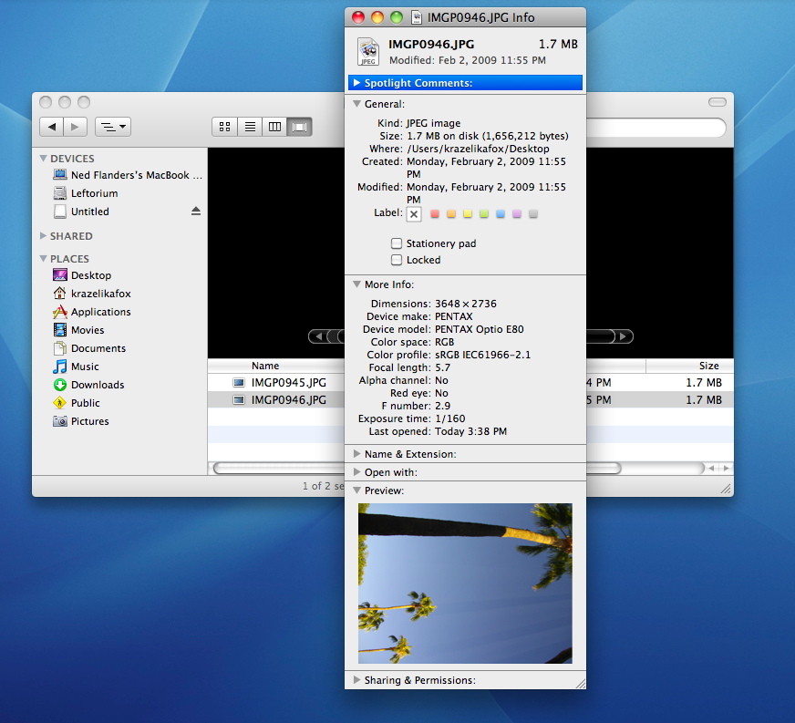EXIF data can be accessed without special software. On a Windows computer, simply right-click on an image, click “propertiesâ€, click the “details†or “summary†tab and scroll to bottom and click “advanced†(example below). On an Apple computer right-click (ctrl-click) on an image, click “Get Info†and expand the “More Info:†section by clicking on the triangle (example below, scroll past windows example). This doesn’t usually give you all the EXIF data however, so for that you need some software. Many photo editing programs have the capability to read all or most of the EXIF data. There are also a number of other softwares out there dedicated solely for viewing this information. Unfortunately, they are not usually developed by a reputable company, which means if you do use them you do so at you and your computers own risk.